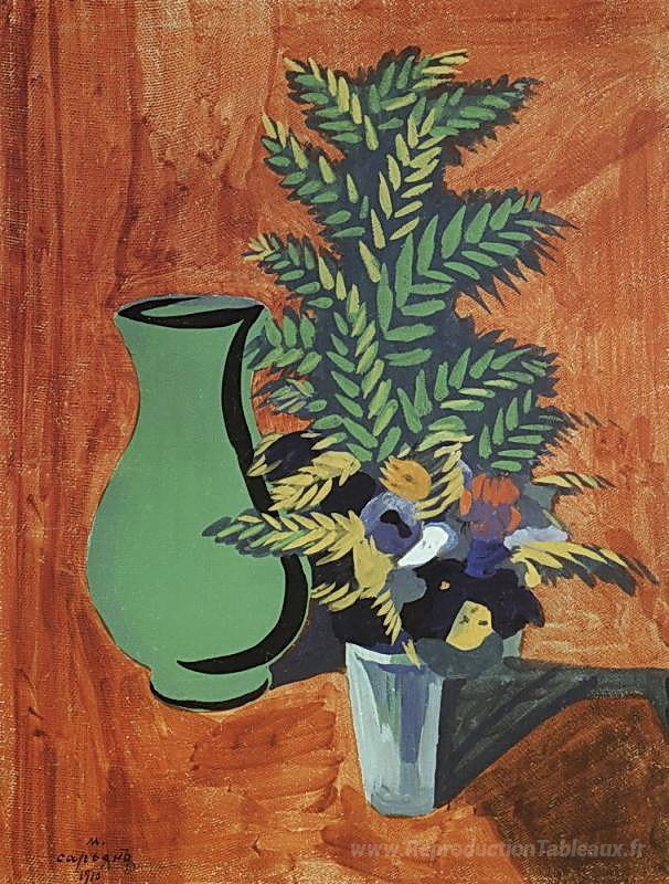 Nous vous proposons une reproduction artisanale sur toile du célèbre tableau 'Pouche verte et bouquet' de Martiros Saryan, provenant du Musée de la Reproduction.