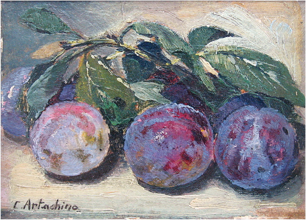 Nous vous proposons une reproduction artisanale sur toile du célèbre tableau 'Prunes' de Constantin Artachino, provenant du Musée de la Reproduction.