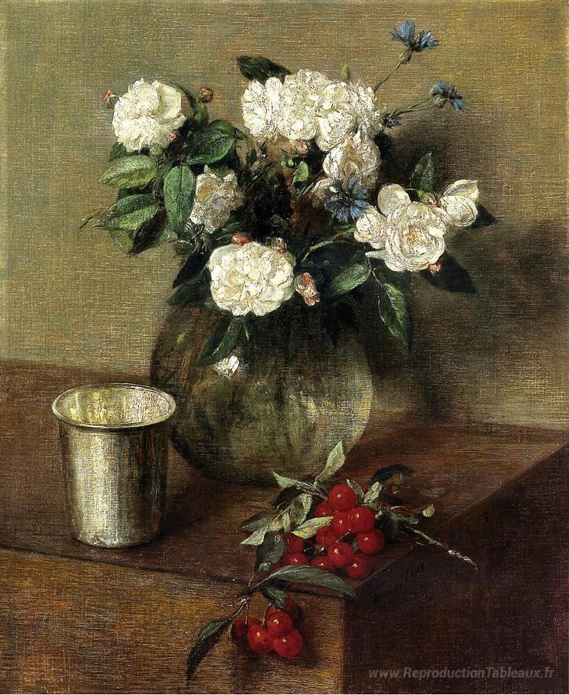 Nous vous proposons une reproduction artisanale sur toile du célèbre tableau 'Roses et cerises blanches' de Henri Fantin-Latour, provenant du Musée de la Reproduction.