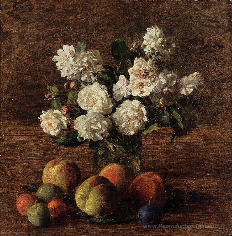 Nous vous proposons une reproduction artisanale sur toile du célèbre tableau 'Roses et fruits de nature morte' de Henri Fantin-Latour, provenant du Musée de la Reproduction.