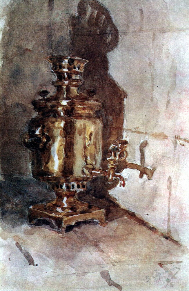 Nous vous proposons une reproduction artisanale sur toile du célèbre tableau 'Samovar' de Vasily Surikov, provenant du Musée de la Reproduction.
