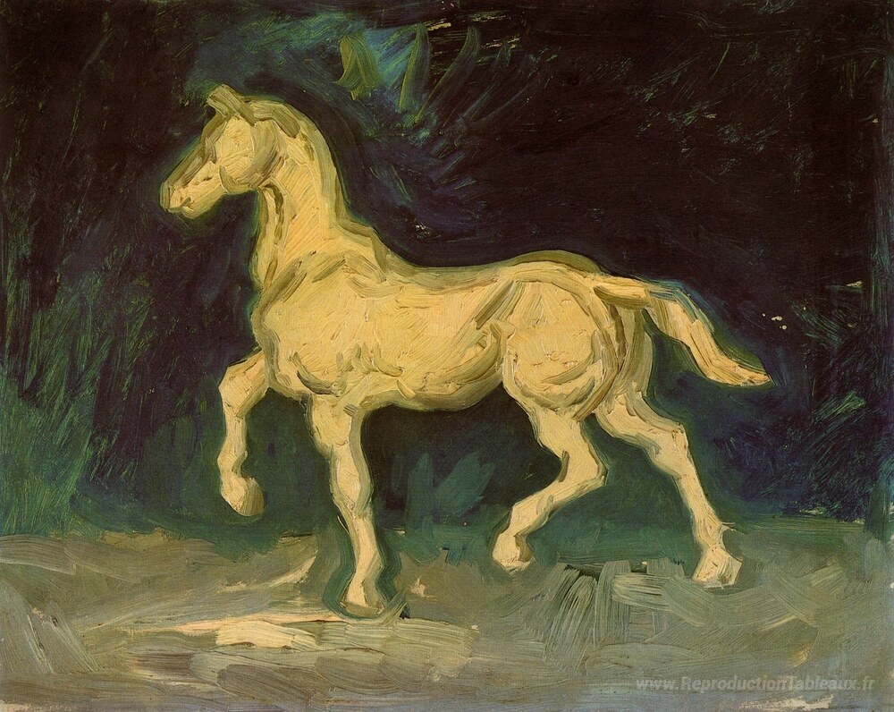 Nous vous proposons une reproduction artisanale sur toile du célèbre tableau 'Statuette en plâtre d'un cheval' de Vincent van Gogh, provenant du Musée de la Reproduction.