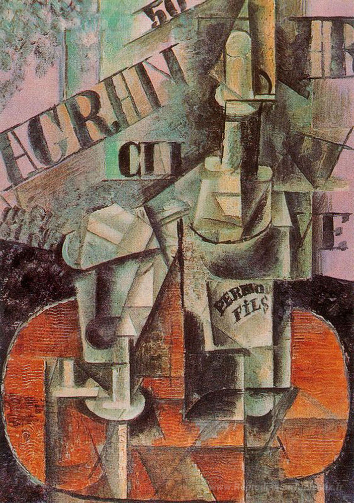 Nous vous proposons une reproduction artisanale sur toile du célèbre tableau 'Table dans un café (bouteille de Pernod)' de Pablo Picasso, provenant du Musée de la Reproduction.