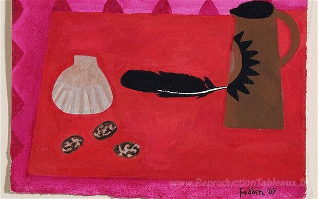 Nous vous proposons une reproduction artisanale sur toile du célèbre tableau 'Table rouge, cruche brune' de Mary Fedden, provenant du Musée de la Reproduction.