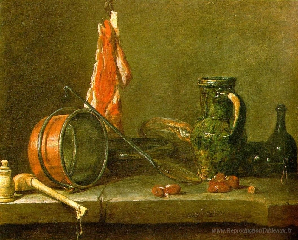 Nous vous proposons une reproduction artisanale sur toile du célèbre tableau 'Une alimentation maigre avec des ustensiles de cuisson' de Jean-Baptiste-Simeon Chardin, provenant du Musée de la Reproduction.
