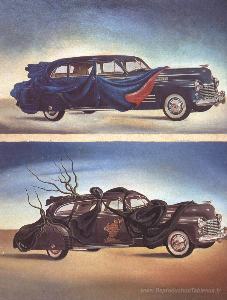 Nous vous proposons une reproduction artisanale sur toile du célèbre tableau 'Vêtements de voiture (automobile vêtu)' de Salvador Dali, provenant du Musée de la Reproduction.