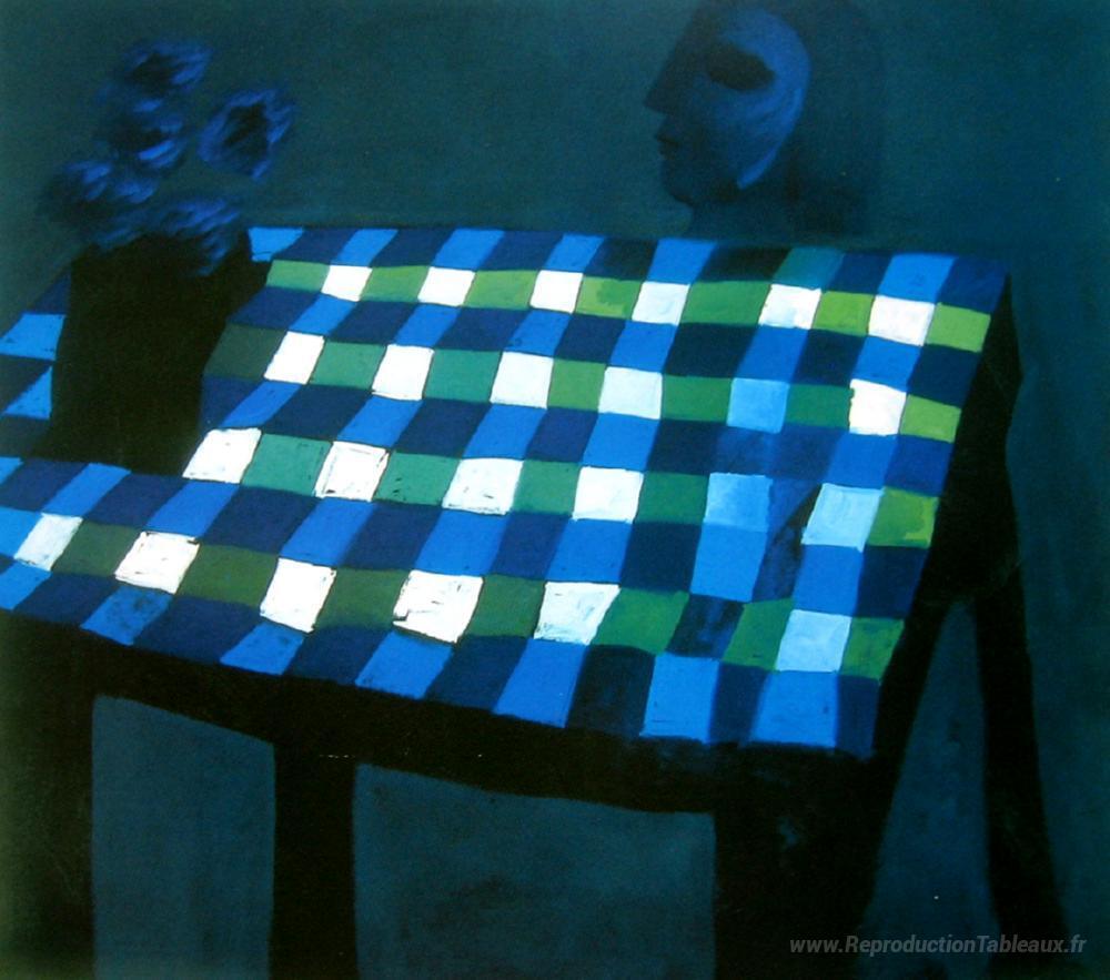 Nous vous proposons une reproduction artisanale sur toile du célèbre tableau 'Vase figure et nappe à carreaux' de Charles Blackman, provenant du Musée de la Reproduction.