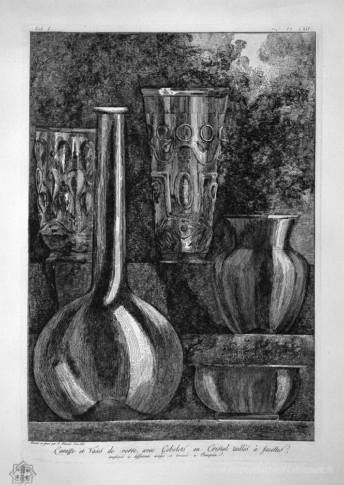 Nous vous proposons une reproduction artisanale sur toile du célèbre tableau 'Vastes de bouteille et de verre et à facettes en cristal, trouvé' de Giovanni Battista Piranesi, provenant du Musée de la Reproduction.