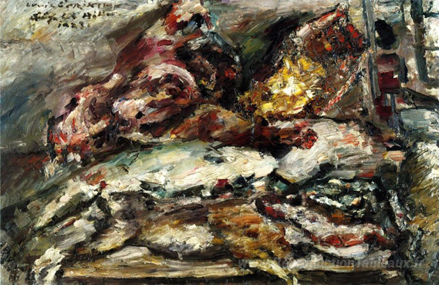 Nous vous proposons une reproduction artisanale sur toile du célèbre tableau 'Viande et poisson à Hiller's Berlin' de Lovis Corinth, provenant du Musée de la Reproduction.