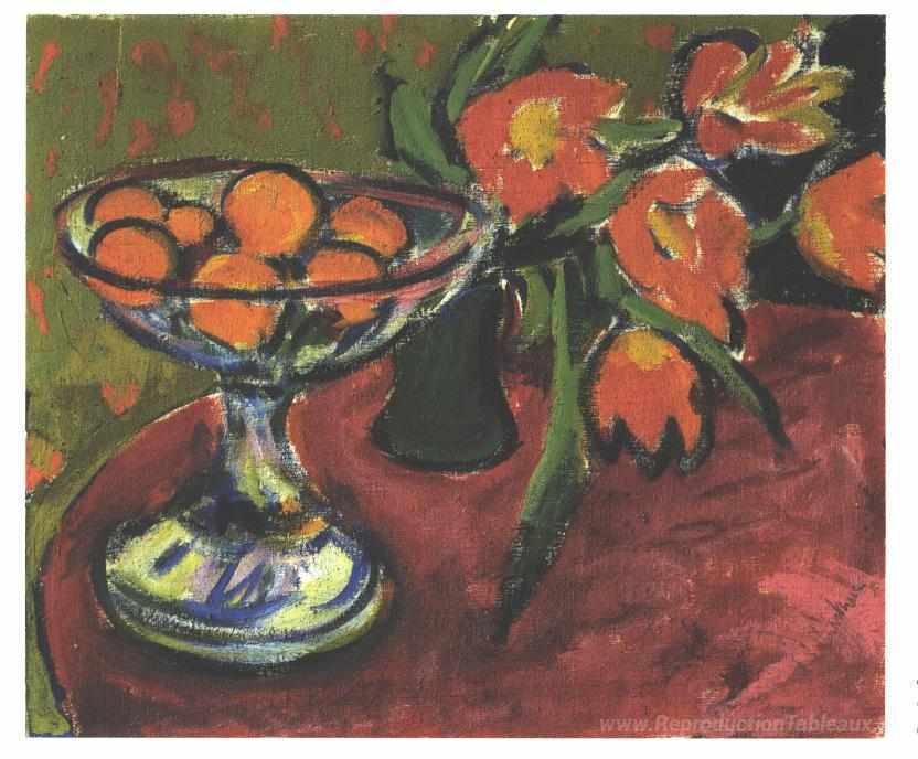 Nous vous proposons une reproduction artisanale sur toile du célèbre tableau 'Vivez toujours avec des tulipes et des oranges' de Ernst Ludwig Kirchner, provenant du Musée de la Reproduction.
