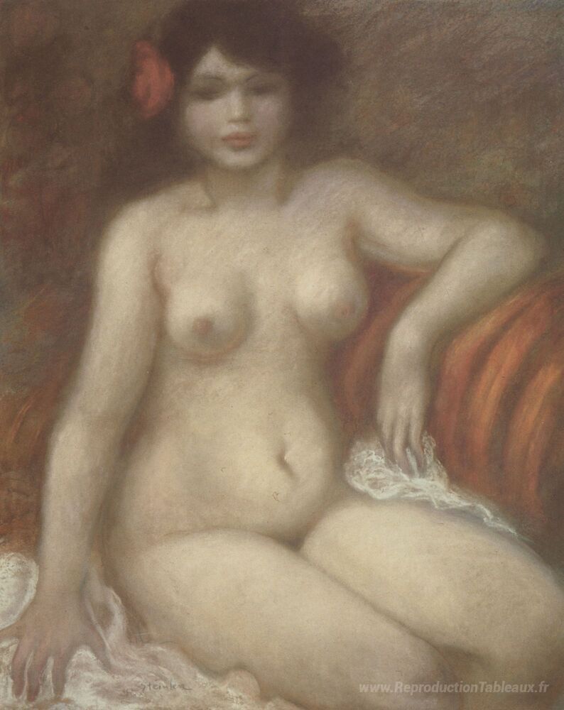 Nous vous proposons une reproduction artisanale sur toile du célèbre tableau 'Assis nu' de Theophile Steinlen, provenant du Musée de la Reproduction.