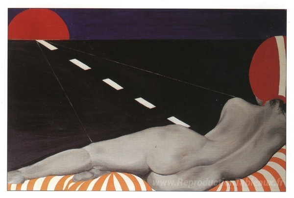 Nous vous proposons une reproduction artisanale sur toile du célèbre tableau 'Auto-stop' de Evelyne Axell, provenant du Musée de la Reproduction.