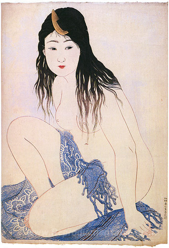 Nous vous proposons une reproduction artisanale sur toile du célèbre tableau 'Awabi Pearl Fisher' de Shotei Takahashi, provenant du Musée de la Reproduction.