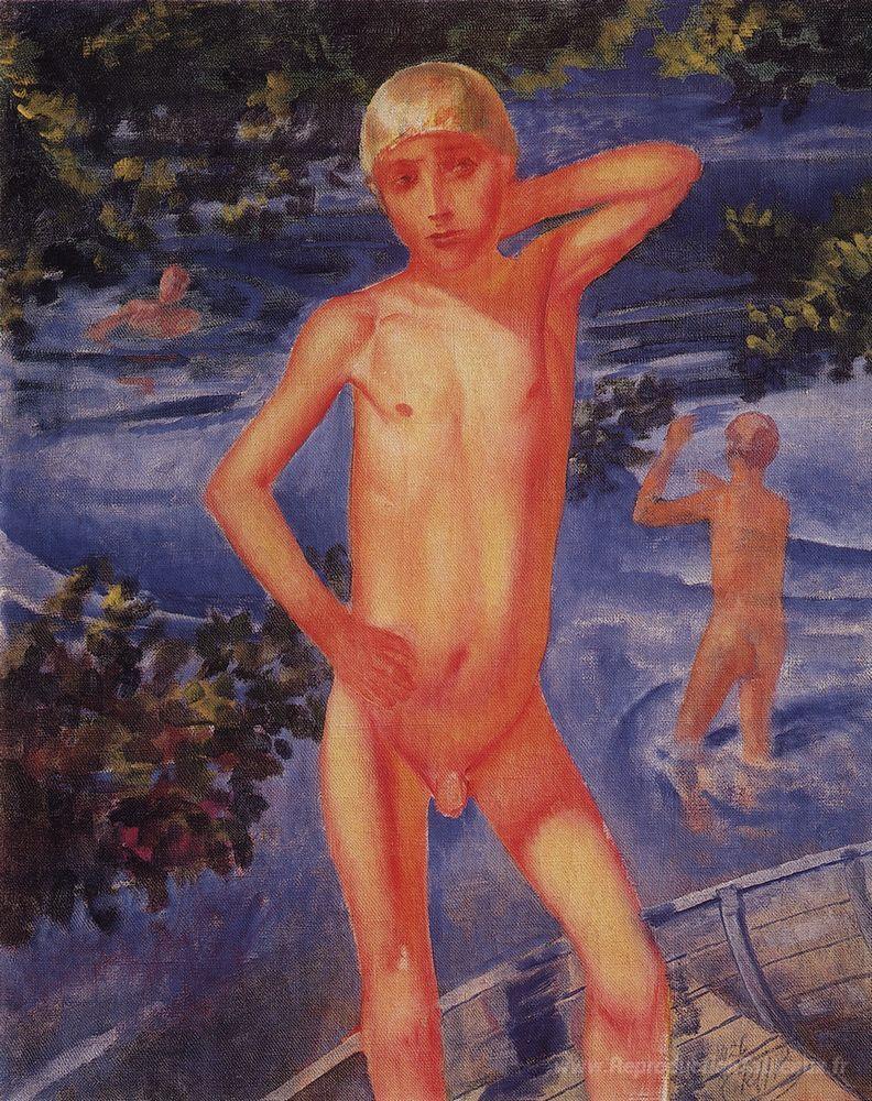 Nous vous proposons une reproduction artisanale sur toile du célèbre tableau 'Baignade' de Kuzma Petrov-Vodkin, provenant du Musée de la Reproduction.