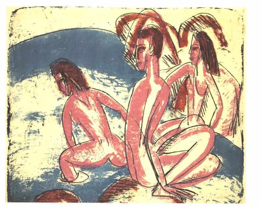 Nous vous proposons une reproduction artisanale sur toile du célèbre tableau 'Baigneurs d'arbres assis sur des rochers' de Ernst Ludwig Kirchner, provenant du Musée de la Reproduction.