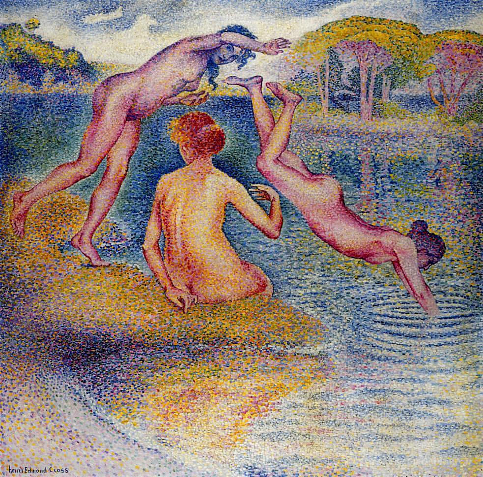 Nous vous proposons une reproduction artisanale sur toile du célèbre tableau 'Baigneurs' de Henri-Edmond Cross, provenant du Musée de la Reproduction.