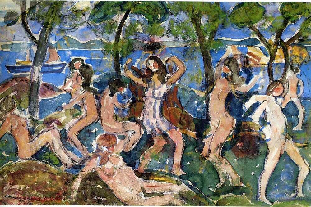 Nous vous proposons une reproduction artisanale sur toile du célèbre tableau 'Baigneurs' de Maurice Prendergast, provenant du Musée de la Reproduction.
