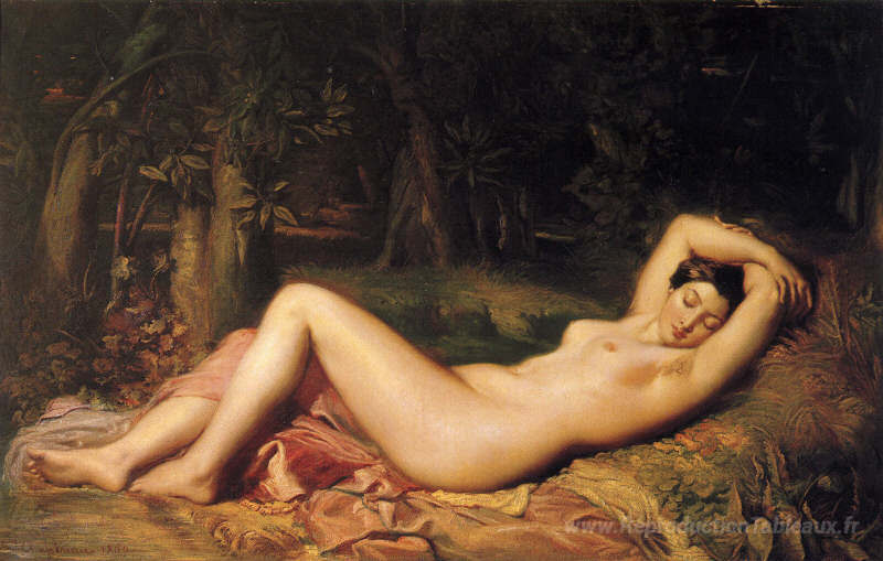 Nous vous proposons une reproduction artisanale sur toile du célèbre tableau 'Baigneuse endormie' de Theodore Chasseriau, provenant du Musée de la Reproduction.