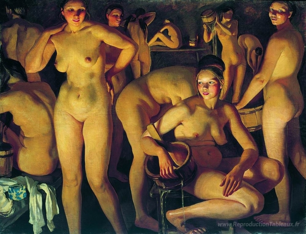 Nous vous proposons une reproduction artisanale sur toile du célèbre tableau 'Bain' de Zinaida Serebriakova, provenant du Musée de la Reproduction.