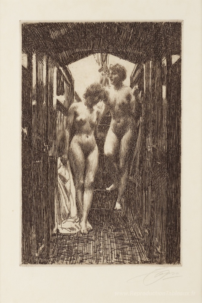 Nous vous proposons une reproduction artisanale sur toile du célèbre tableau 'Cabine' de Anders Zorn, provenant du Musée de la Reproduction.