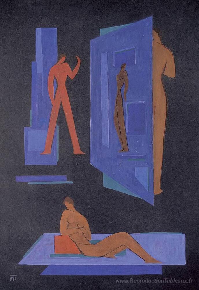 Nous vous proposons une reproduction artisanale sur toile du célèbre tableau 'Composizione (Atteggiamenti)' de Janos Mattis-Teutsch, provenant du Musée de la Reproduction.