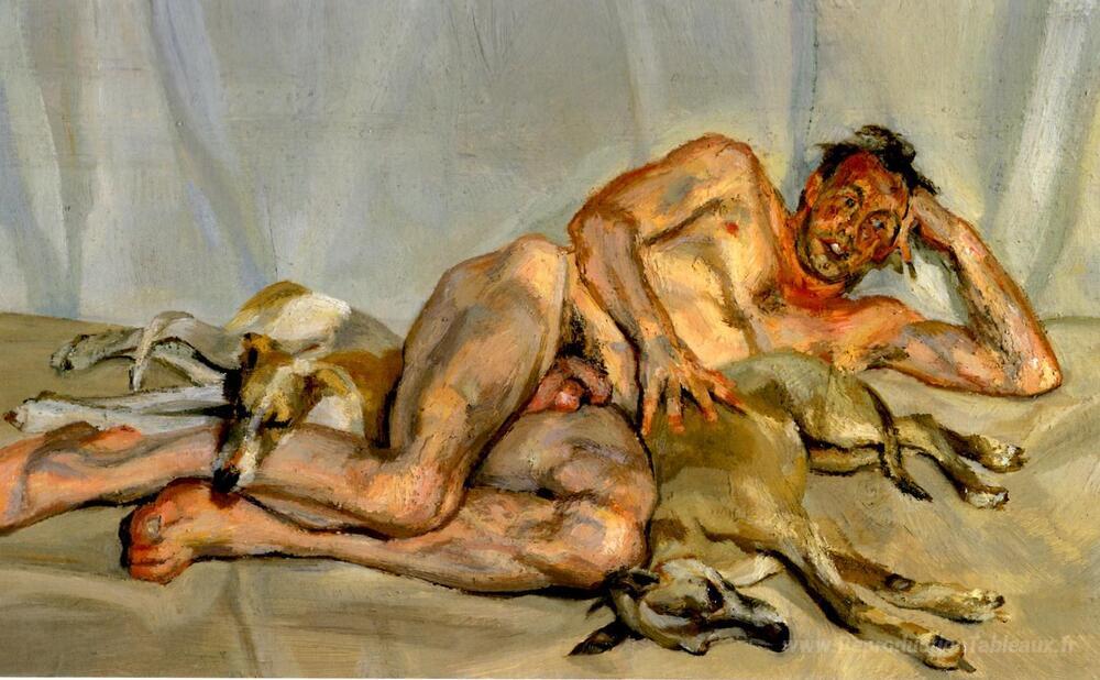 Nous vous proposons une reproduction artisanale sur toile du célèbre tableau 'David, Pluton et Eli' de Lucian Freud, provenant du Musée de la Reproduction.