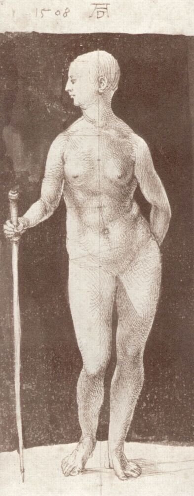 Nous vous proposons une reproduction artisanale sur toile du célèbre tableau 'Debout nue féminine avec un bâton à droite' de Albrecht Durer, provenant du Musée de la Reproduction.