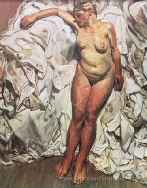 Nous vous proposons une reproduction artisanale sur toile du célèbre tableau 'Debout près des chiffons' de Lucian Freud, provenant du Musée de la Reproduction.