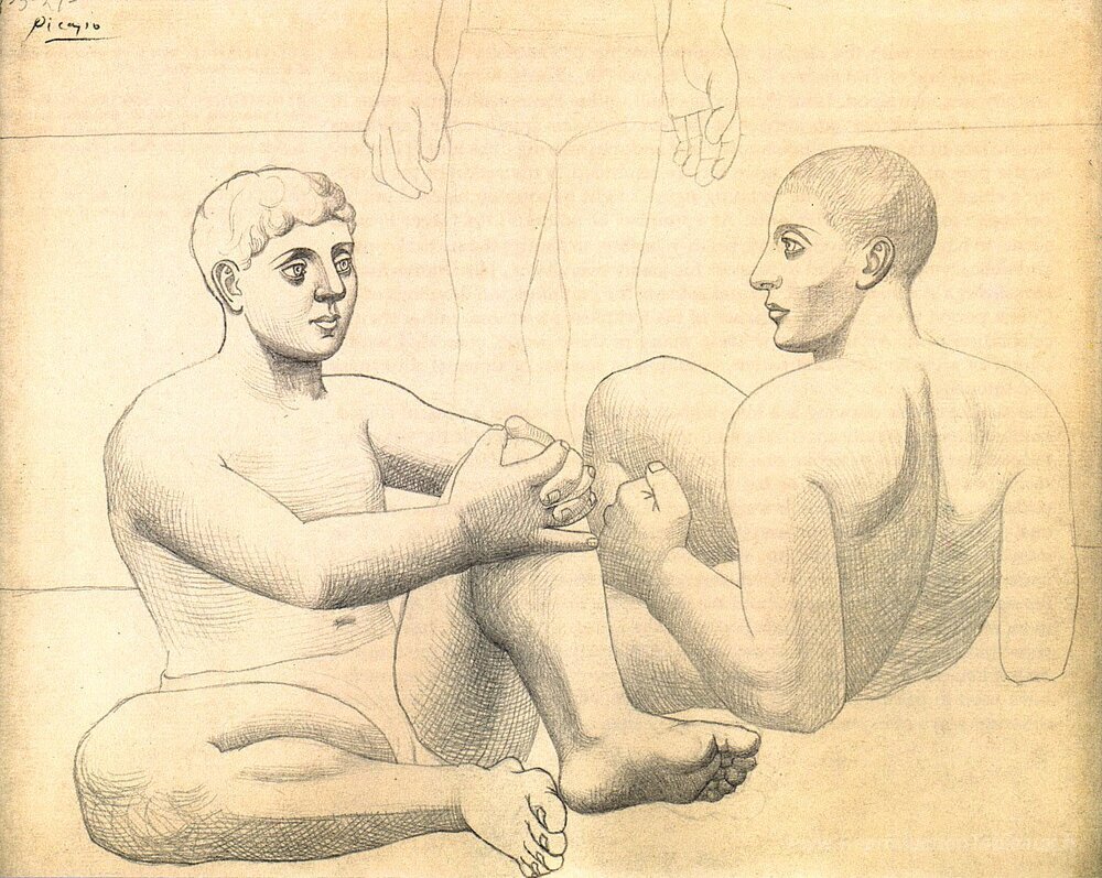 Nous vous proposons une reproduction artisanale sur toile du célèbre tableau 'Deux baigneurs' de Pablo Picasso, provenant du Musée de la Reproduction.