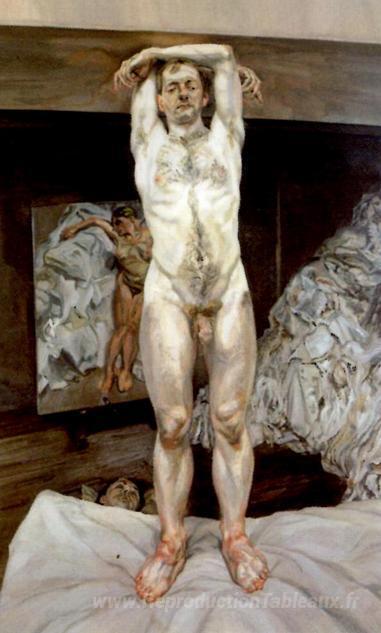Nous vous proposons une reproduction artisanale sur toile du célèbre tableau 'Deux hommes en studio' de Lucian Freud, provenant du Musée de la Reproduction.