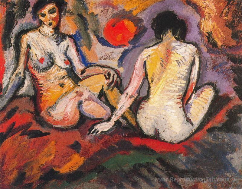 Nous vous proposons une reproduction artisanale sur toile du célèbre tableau 'Deux nus assis' de Albert Bloch, provenant du Musée de la Reproduction.