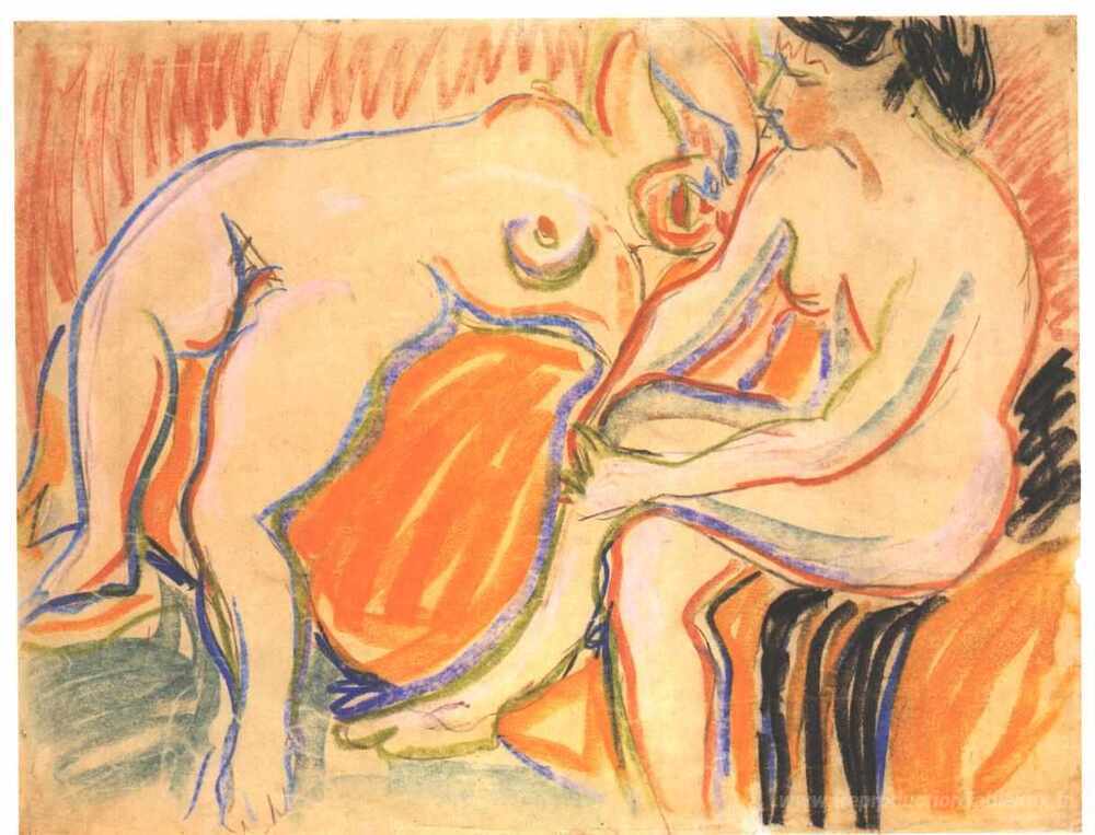 Nous vous proposons une reproduction artisanale sur toile du célèbre tableau 'Deux nus féminines' de Ernst Ludwig Kirchner, provenant du Musée de la Reproduction.