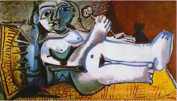 Nous vous proposons une reproduction artisanale sur toile du célèbre tableau 'Femelle allongée nue' de Pablo Picasso, provenant du Musée de la Reproduction.