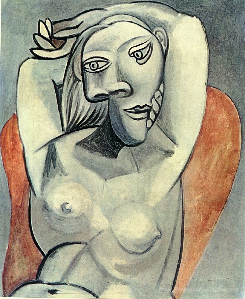Nous vous proposons une reproduction artisanale sur toile du célèbre tableau 'Femme assise dans un fauteuil rouge' de Pablo Picasso, provenant du Musée de la Reproduction.