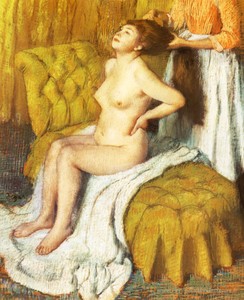 Nous vous proposons une reproduction artisanale sur toile du célèbre tableau 'Femme ayant les cheveux peignés' de Edgar Degas, provenant du Musée de la Reproduction.