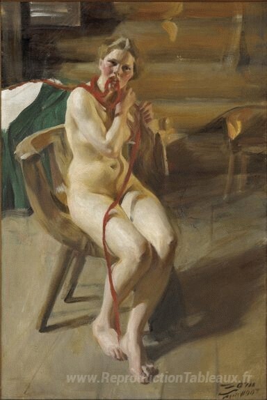 Nous vous proposons une reproduction artisanale sur toile du célèbre tableau 'Femme nue arrangeant ses cheveux' de Anders Zorn, provenant du Musée de la Reproduction.