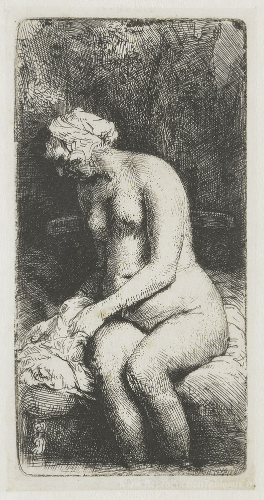 Nous vous proposons une reproduction artisanale sur toile du célèbre tableau 'Femme nue assis (femme baignant ses pieds dans un ruisseau)' de Rembrandt, provenant du Musée de la Reproduction.