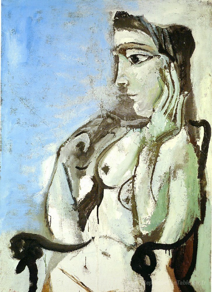 Nous vous proposons une reproduction artisanale sur toile du célèbre tableau 'Femme nue assise dans le fauteuil' de Pablo Picasso, provenant du Musée de la Reproduction.