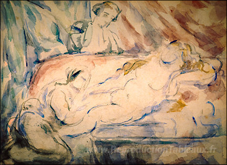 Nous vous proposons une reproduction artisanale sur toile du célèbre tableau 'Femme nue avec des préposés' de Paul Cezanne, provenant du Musée de la Reproduction.