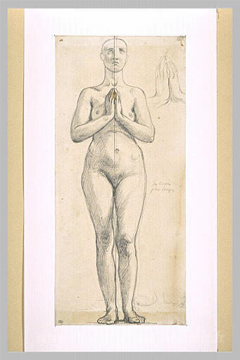 Nous vous proposons une reproduction artisanale sur toile du célèbre tableau 'Femme nue debout, vue avant, mains jointes devant la poitrine' de Jean Auguste Dominique Ingres, provenant du Musée de la Reproduction.