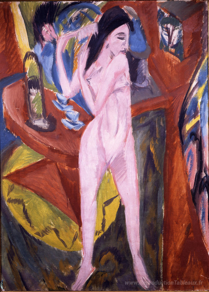 Nous vous proposons une reproduction artisanale sur toile du célèbre tableau 'Femme nue en peignant les cheveux' de Ernst Ludwig Kirchner, provenant du Musée de la Reproduction.