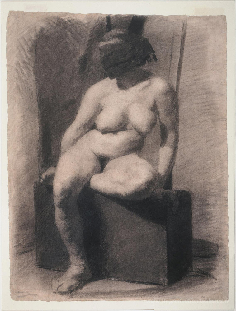 Nous vous proposons une reproduction artisanale sur toile du célèbre tableau 'Femme nue masquée, assise' de Thomas Eakins, provenant du Musée de la Reproduction.