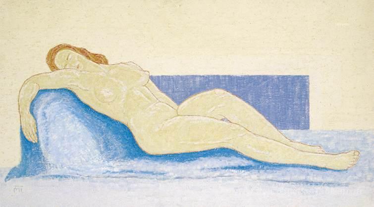Nous vous proposons une reproduction artisanale sur toile du célèbre tableau 'Femme sur un divan bleu' de Janos Mattis-Teutsch, provenant du Musée de la Reproduction.