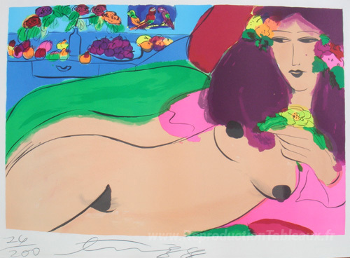 Nous vous proposons une reproduction artisanale sur toile du célèbre tableau 'Femmes avec des fleurs' de Walasse Ting, provenant du Musée de la Reproduction.