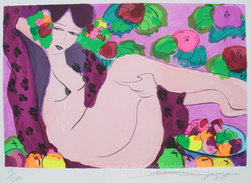 Nous vous proposons une reproduction artisanale sur toile du célèbre tableau 'Femmes avec des fruits' de Walasse Ting, provenant du Musée de la Reproduction.