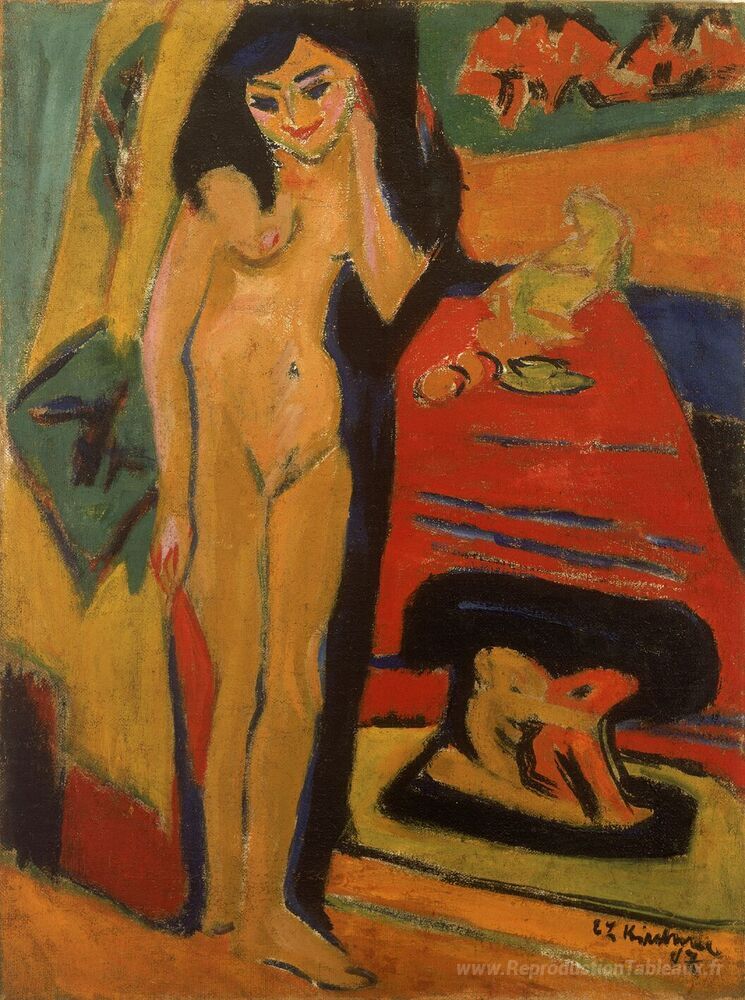 Nous vous proposons une reproduction artisanale sur toile du célèbre tableau 'Fille nue derrière le rideau (Franzi)' de Ernst Ludwig Kirchner, provenant du Musée de la Reproduction.