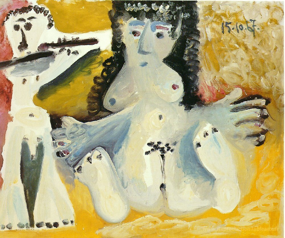 Nous vous proposons une reproduction artisanale sur toile du célèbre tableau 'Homme assis jouant de la flûte' de Pablo Picasso, provenant du Musée de la Reproduction.