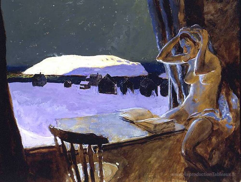 Nous vous proposons une reproduction artisanale sur toile du célèbre tableau 'Instituteur de Monhegan' de Jamie Wyeth, provenant du Musée de la Reproduction.
