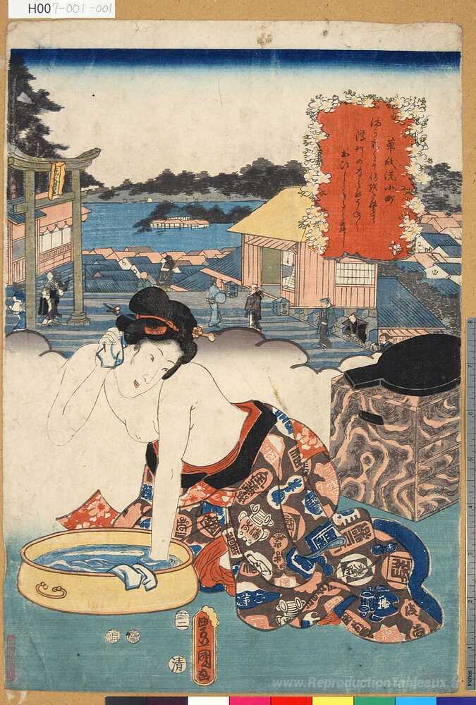 Nous vous proposons une reproduction artisanale sur toile du célèbre tableau 'Komachi lavaggio Soshi' de Utagawa Kunisada, provenant du Musée de la Reproduction.