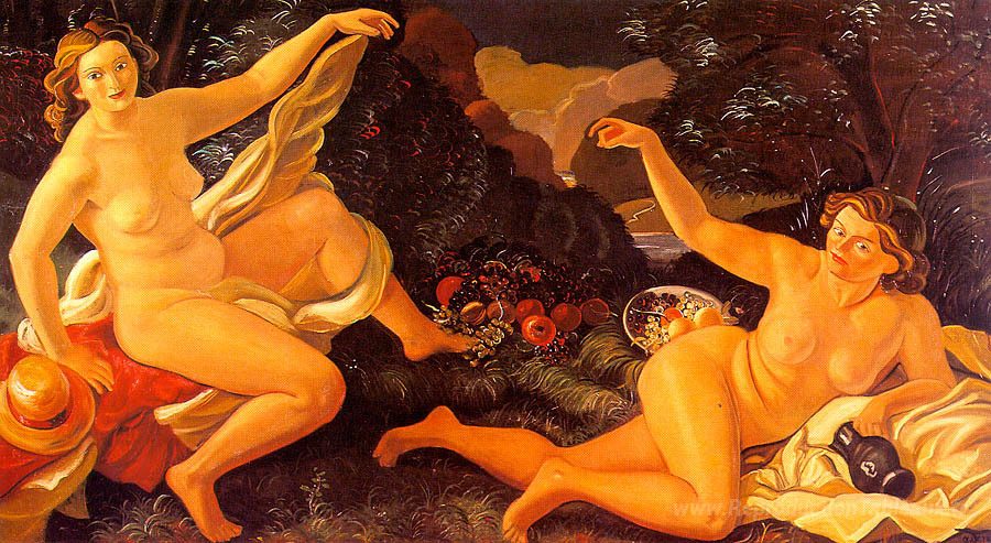 Nous vous proposons une reproduction artisanale sur toile du célèbre tableau 'La clairière, ou le déjeuner sur l'herbe' de Andre Derain, provenant du Musée de la Reproduction.